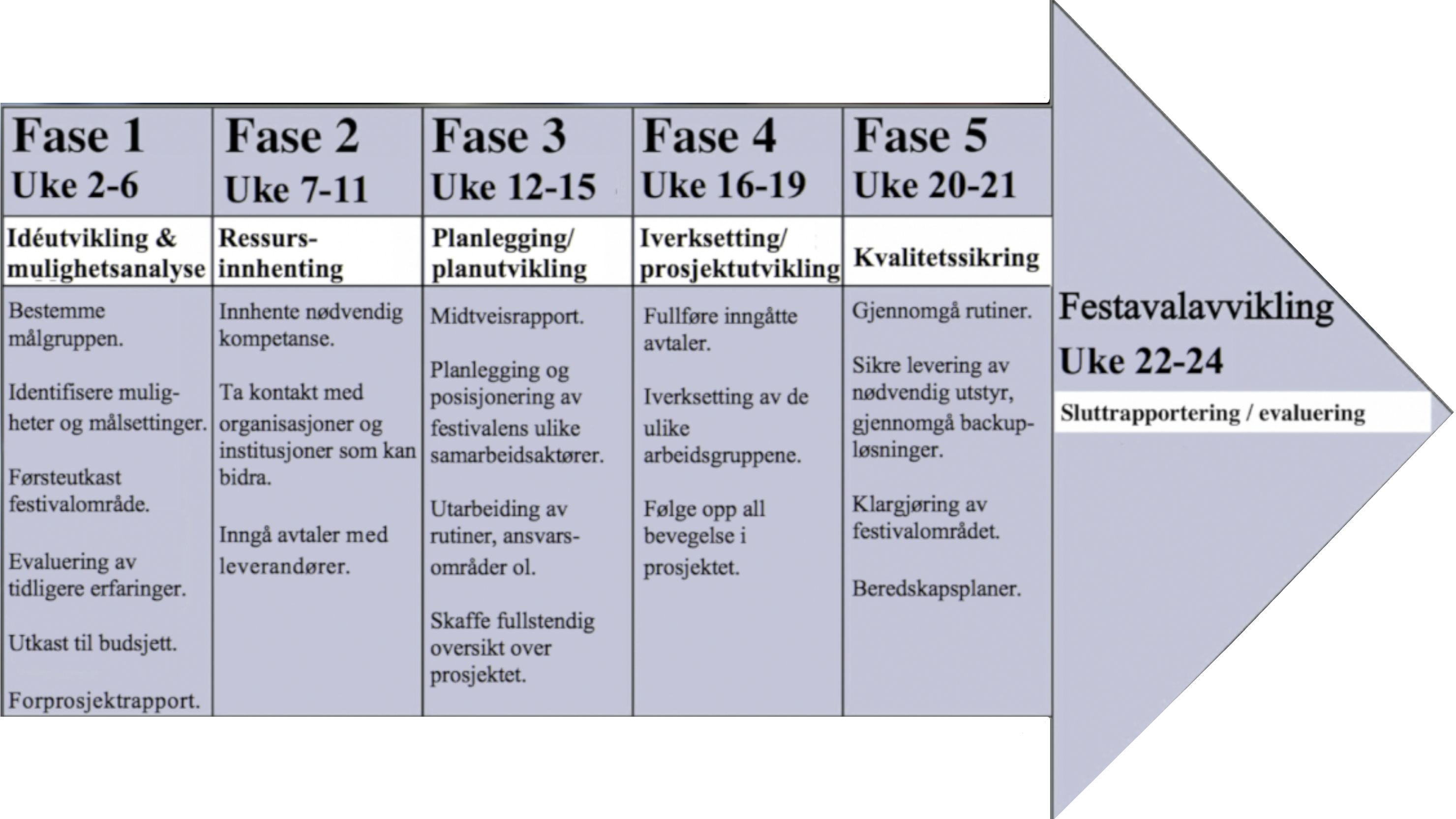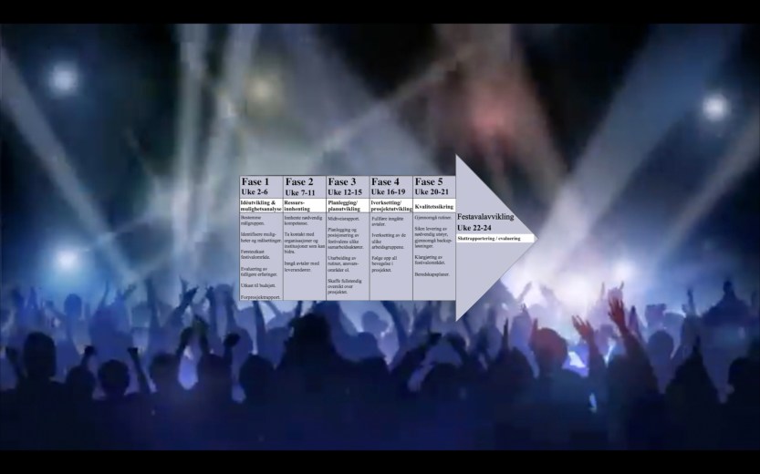 - Målgruppen til festivalen bestemmes, og det diskuteres videre planleggingsstrategier der arbeidsrutiner og posisjonering av deltakere fra forskjellige team avtales, struktureres og kommuniseres ut.