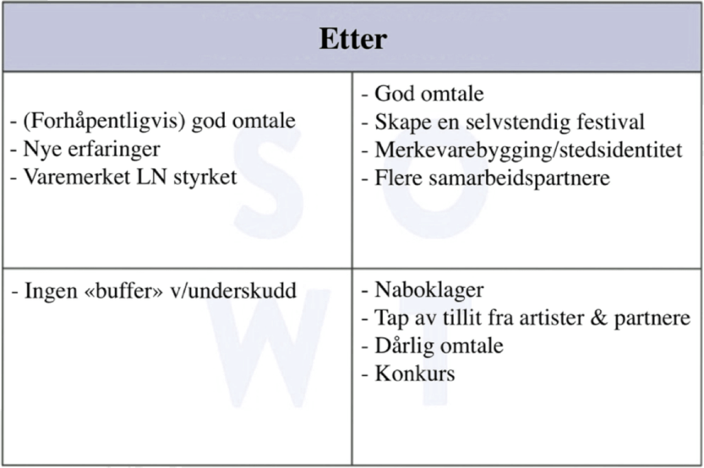 Lyse Netter-festivalen er et prosjekt der mange forhold må tas hensyn til, både før, under og etter avvikling. Prosjektets SWOT-analyse er derfor inndelt etter dette: